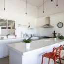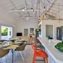 Making your to the main house you'll find the wooden deck comfortably equipped with lounge furnishings, sofas, and another al fresco dining spot. All tucked comfortably under the covered terrace, you can enjoy the persistent sea breezes and stunning scenery at all times. Stepping indoors you still enjoy the views thanks to the open floor plan that features an indoor dining room, living room, and full gourmet kitchen.