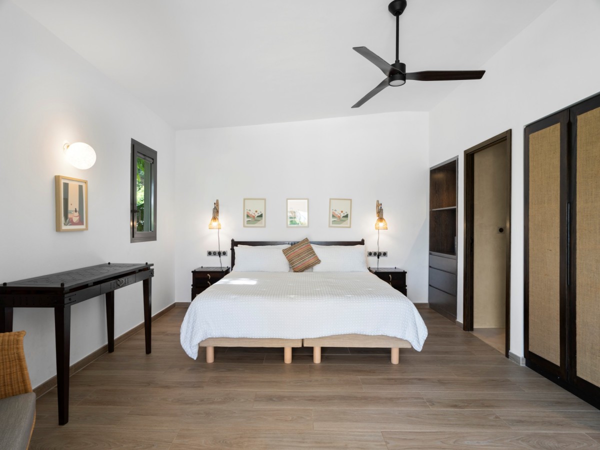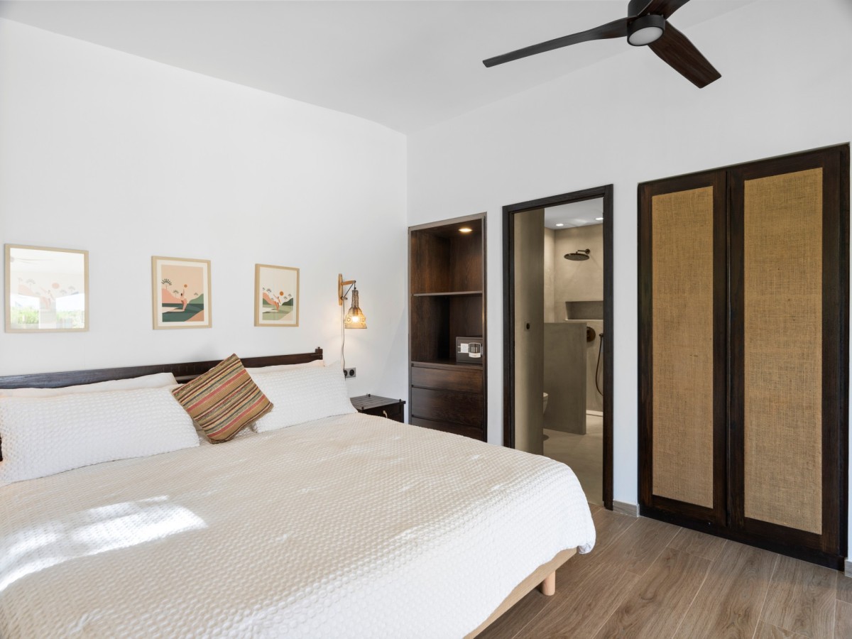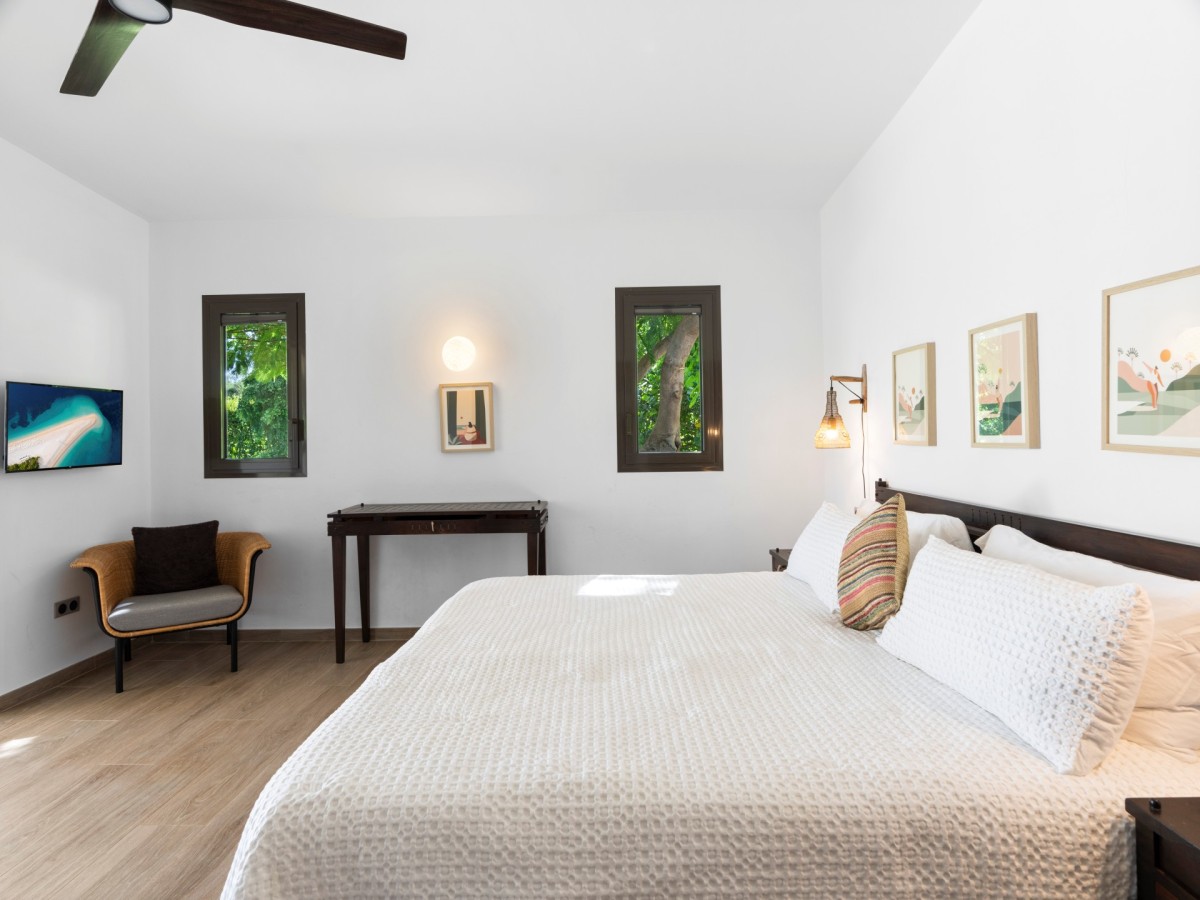 Bedroom 2: Bedroom with a king-size bed, ceiling fan and en-suite bathroom with shower, vanity and WC. 2 guests maximum.