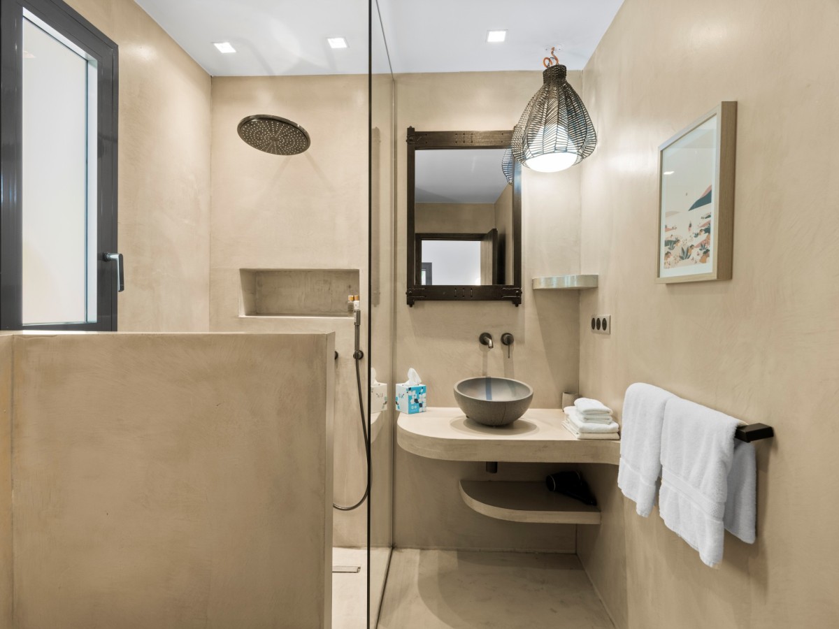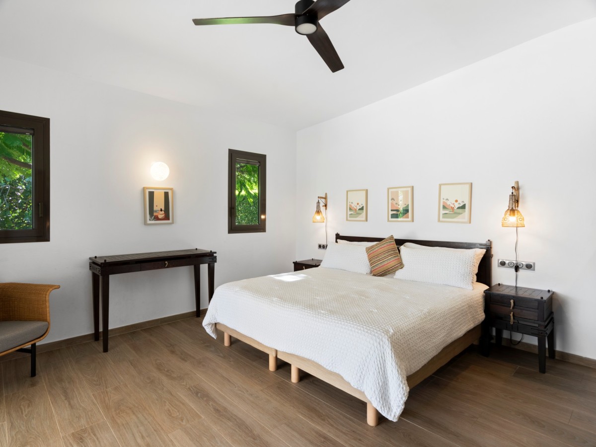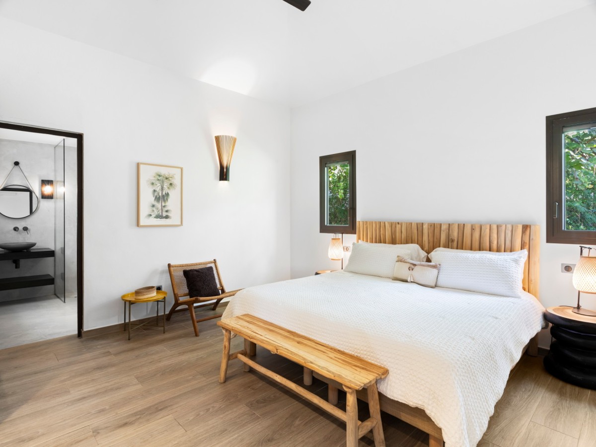 Bedroom 2: Bedroom with a king-size bed, ceiling fan and en-suite bathroom with shower, vanity and WC. 2 guests maximum.