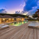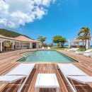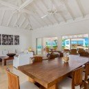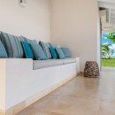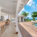 With five bedrooms, each with private en suite baths, the villa can accommodate up to ten guests. The living spaces include roomy and al fresco gathering areas, including a gourmet kitchen and dining area open to the sea.