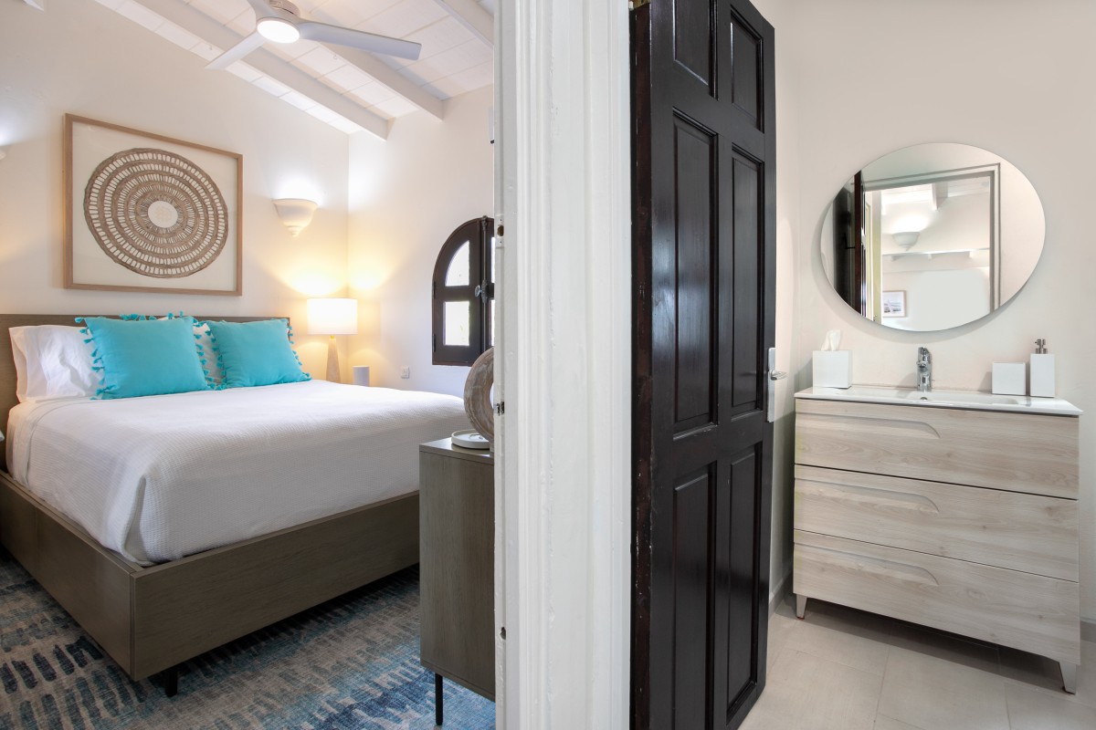 Bedroom 2: First floor bedroom with a king-size bed, A/C, ceiling fan, WiFi, TV, safe and en-suite bathroom with shower, vanity and WC. Exterior entrance. 2 guests maximum.
