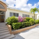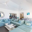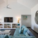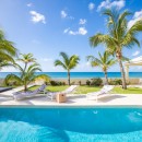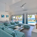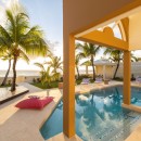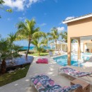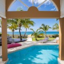 Beach Secrets sits behind a small stone wall dotted with seashells and a gate that opens directly onto the beach in Burgeaux Bay, Beacon Hill, St. Martin. A sprawling lawn bisected by a path from the living room to the beach divides a patio deck from the pool. The patio deck appears to float on the lawn, offering seaside lounge sofas hidden beneath the palms for both shade and privacy. The pool seems like part of the villa itself, with stairs leading down into the water also supporting the foundation weight for two pillars of a vestibule.