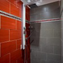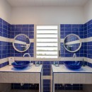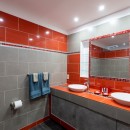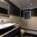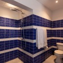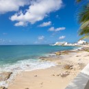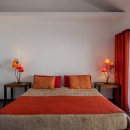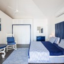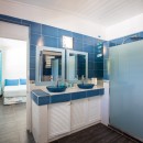 Four bedrooms—three kings and one with two queens—play with color at Villa Beach Secrets. One king bedroom has white walls with coral red. From the large, quilt-patch headboard alternating solid with textured reds, to the heavy red drapes, this room is like a coral cove with the ocean view beyond. The en-suite bathroom displays matching deep red walls. Another king bedroom features rich silver bedding, a variety of mirrors, and decorative black-and-white tile in the en-suite bathroom. Each king bedroom has pool terrace access and ocean views.