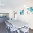 The main living space at Beach Secrets is decorated with a collection of shells and two coral-shaped lamps on either side of a flat screen television in the main room. A large white sectional, with ocean-blue accent pillows, sits around three sides of a white-marble and glass coffee table. In the dining area next to the main room, the coral theme is carried over with chair-backs designed to look like coral or like reflections on the water. Abstract blue paintings and soft lighting complete this space.