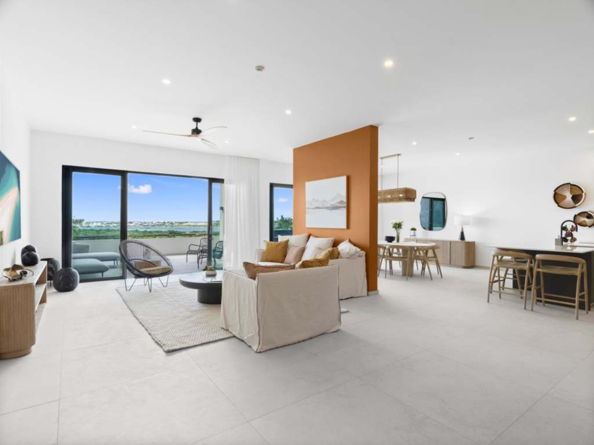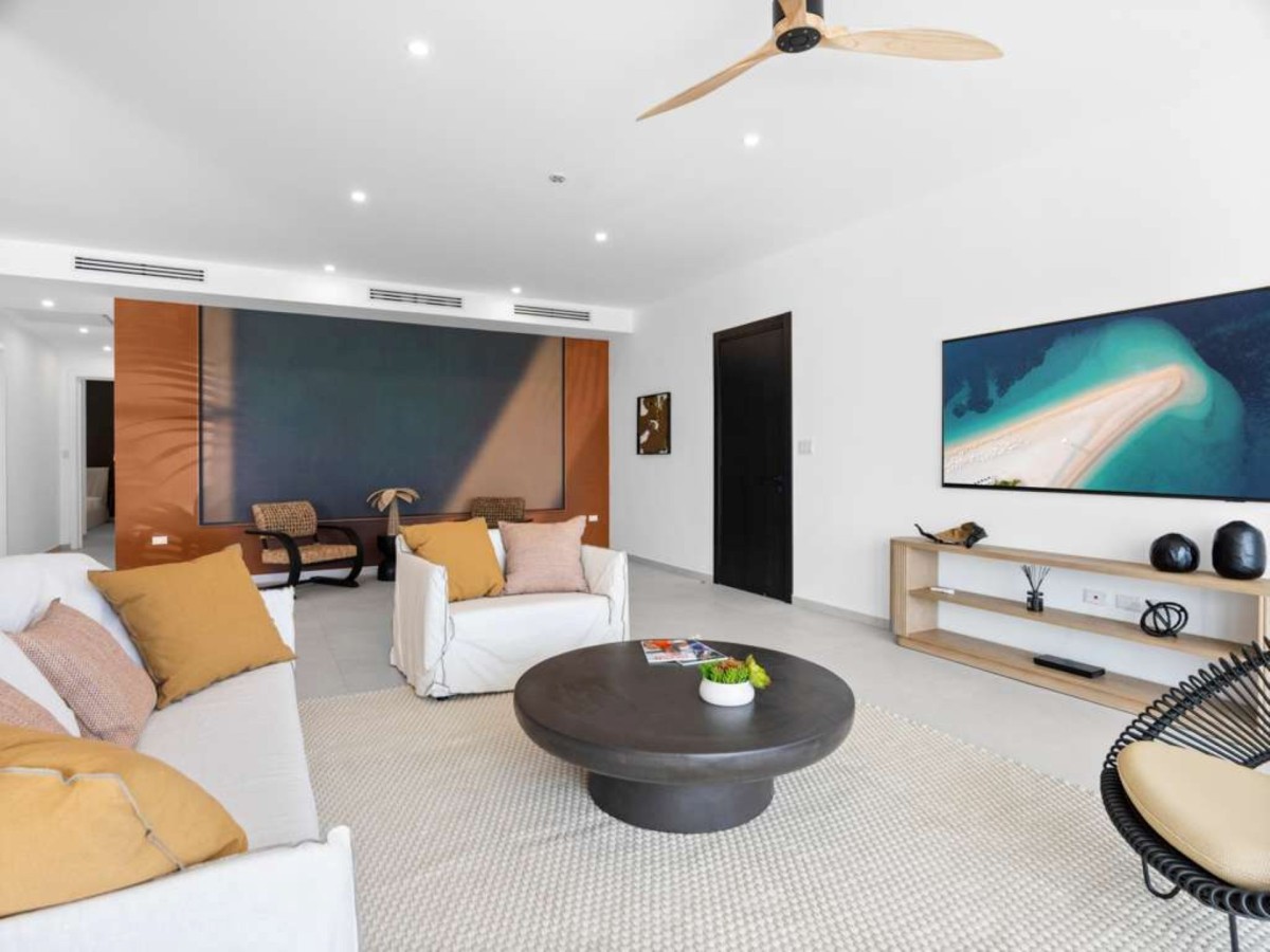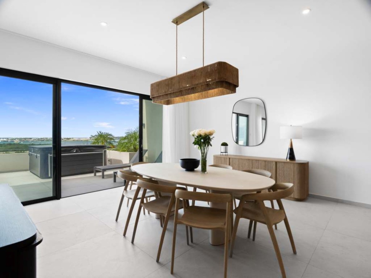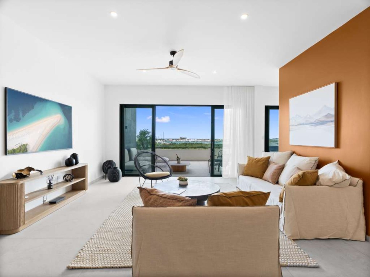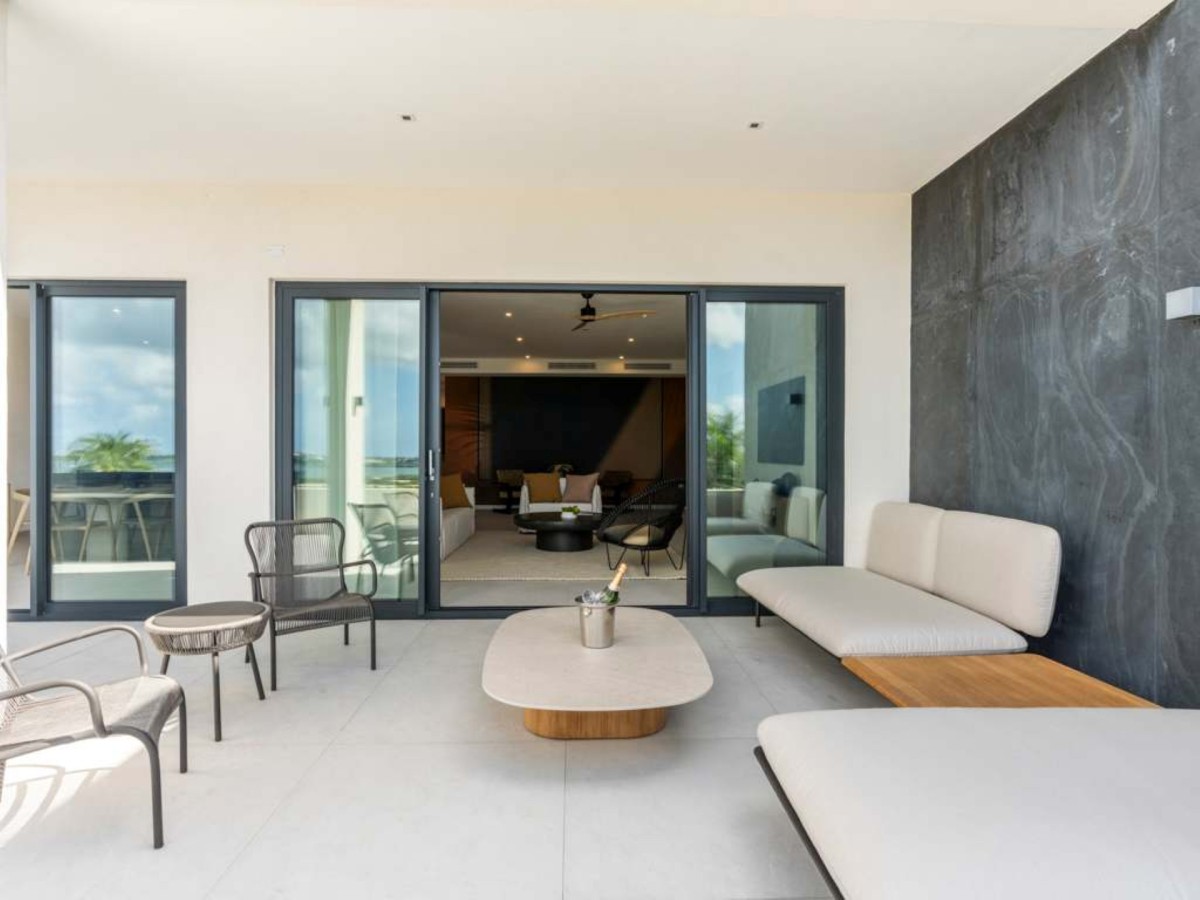A private elevator opens directly into your residence, where thoughtfully curated Restoration Hardware interiors create an atmosphere of understated luxury. Two generously proportioned bedrooms provide serene sanctuaries, while expansive open-plan living spaces flow seamlessly onto a spacious terrace complete with jacuzzi—an ideal vantage point for capturing breathtaking airport vistas and magnificent Caribbean sunsets.