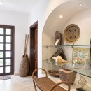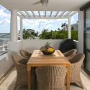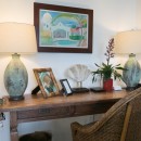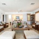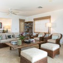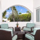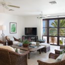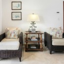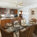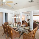 The decor at Villa Blue Dove is warm and inviting, utilizing soft lighting, dark wicker furniture, and teak wood with white cushions, white walls, and classical pastel prints. A fantastic wooden coffee table completes the main living room decor with a colorful, tropical bromeliad to pull the room together. The main living space is adjacent to the main dining area, but the two are bisected by four, stately pillars in the style of ancient Greece.