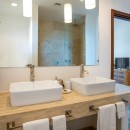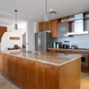 Inside, the contemporary kitchen is fitted with high-end appliances, and an indoor dining space provides the option of meals in cool, air-conditioned comfort. A conveniently placed desk nook makes it easy to balance a little work with plenty of leisure.