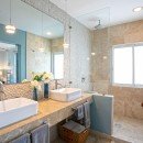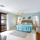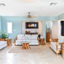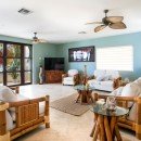 Sea Esta has a curved stairway and a central elevator to go between levels of the building and visit the large shared living space on the second level. Cane ceiling fans, comfortable bamboo couches, and warm wood tones add to the tropical feel while the central white columns break off the space leading to a dining room with space for eight to eat.
