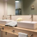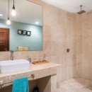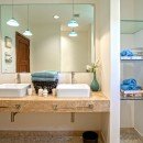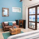 This villa has four levels, all of which are air-conditioned, and comes with a plunge pool on the top floor. The spacious interior area includes a massive open plan kitchen and living area, four bedrooms with ensuite bathrooms, and an extra two guest bathrooms. The entrance level of the home has two king-size bedrooms that offer massive glass-paneled doors and balconies that look over the ocean. Each room has a bathroom with double vanity, pebble flooring, a toilet, and a spacious open shower.