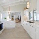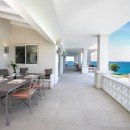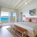 Just a few steps up from the pool, the villa features a large covered terrace where casual dining and lounging become a pure delight. Step inside through the glass doors and you enter the stylish and charming great room. With high, white ceilings and a pale palette accented with bold hues of red and natural wood, this space features a casual living room, dining area and access to the charming kitchen. Large and colorful, it is a space where everyone will enjoy gathering to prepare meals, snacks, and drinks - and all in view of the sea.