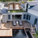 While the interior is gorgeous and full-featured, most guests will prefer to spend their time outdoors. There is a covered terrace where guests can dine or read a book. The other side of the villa includes a pool and a daybed with views of the edge of the ocean and the villa’s private dock. There are open and covered terraces across the villa, as well as a large garden that guests can explore.