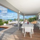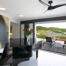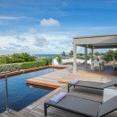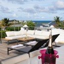 Z’Abricot is inside of a hillside, contemporary building that is newly renovated and offers views of Pinel Island and Orient Bay. The home is inviting and warm with tasteful decorations, air conditioning, and sleek furnishings in reds, whites, and light teak. The interior seating area connects to the well-equipped kitchen where the cook or baker of the group will want to spend all their time.