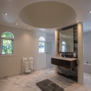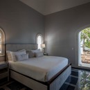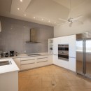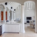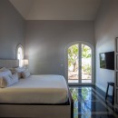 Stepping inside through the elegant arched doorways leads to the modern and stylish great room. With cathedral ceilings and a palette emphasizing lots of shades of cream and white, it is a bright and yet soothingly cool space that captures the breezy airiness of the setting while creating a sense of retreat and escape. The open floor plan features a modern gourmet kitchen that has direct access to the terrace. There is also a living room with entertainment system and oversized sofas, and a formal dining space that also takes in the views.