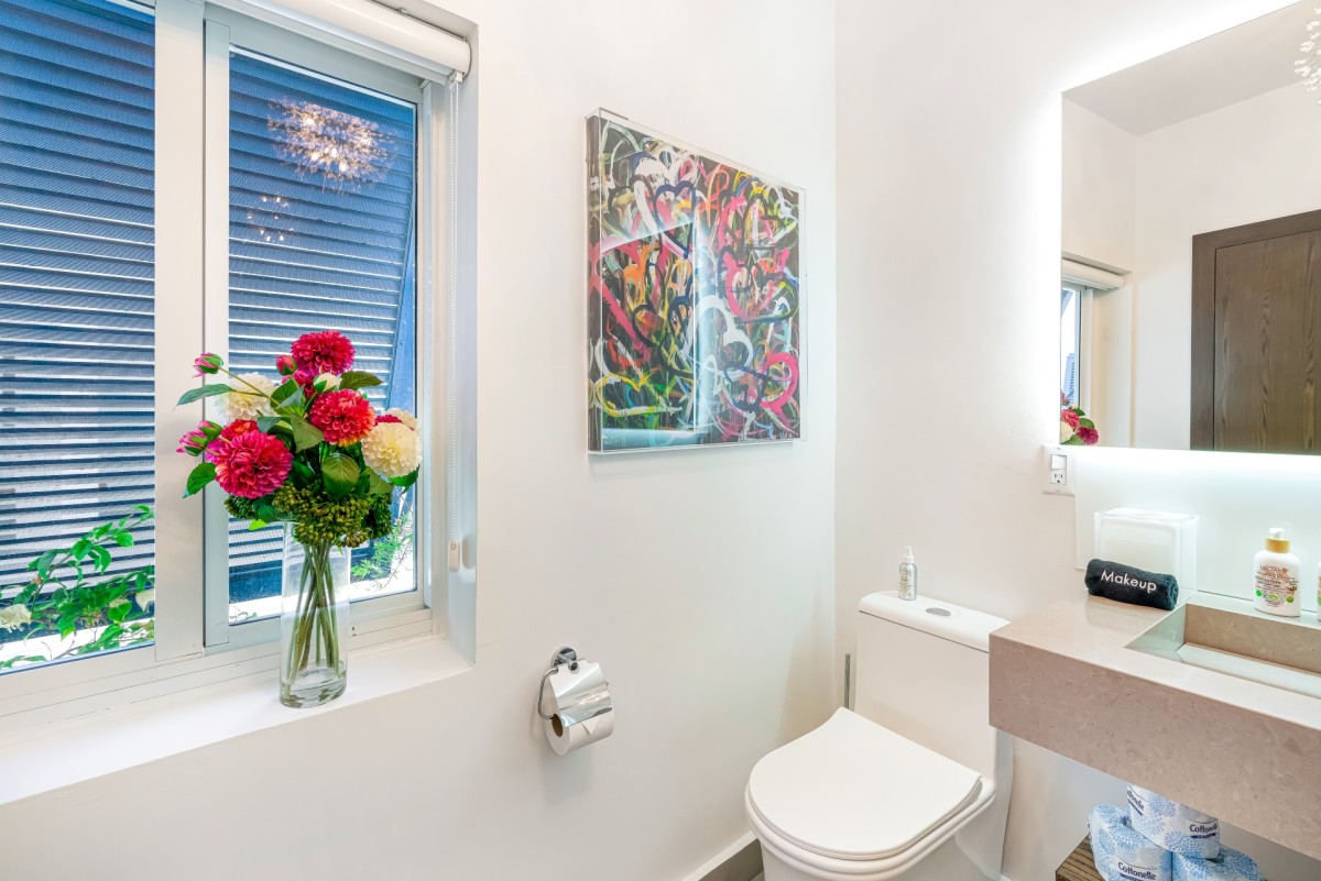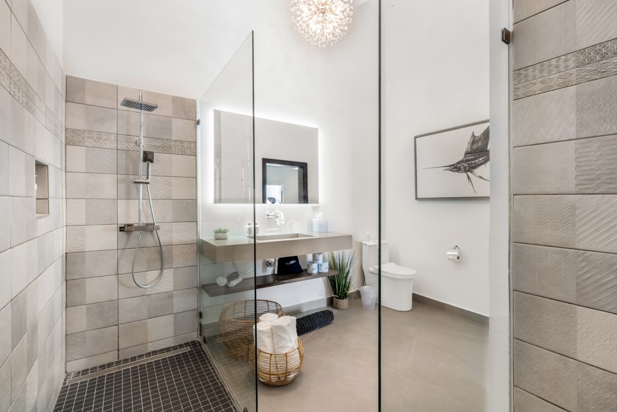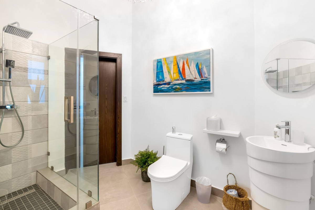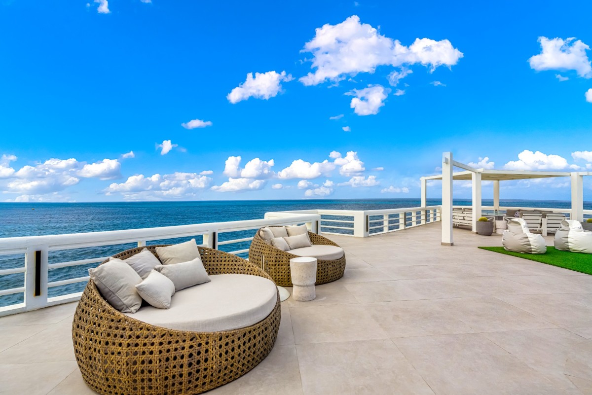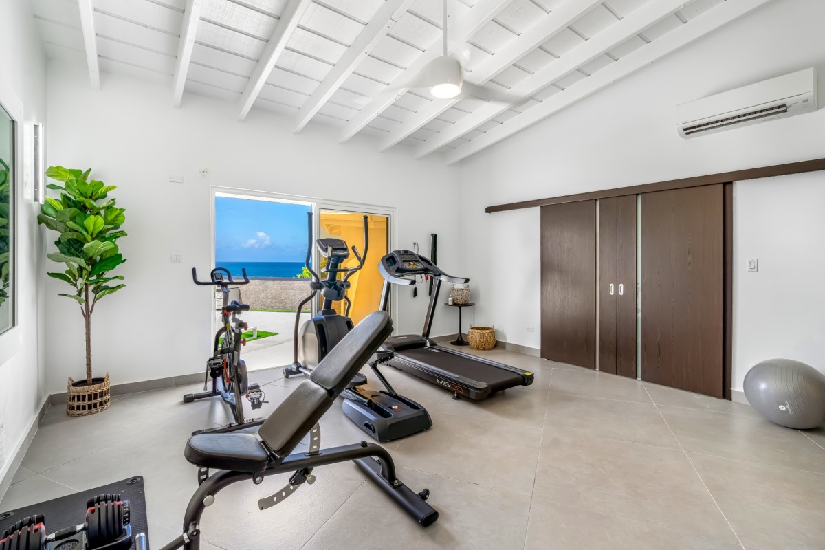 Each of the six airy bedrooms features a neutral palette, abundant natural light, and a private ensuite bathroom. Additional amenities include a fully equipped gym with sea views, WiFi, cable TV, and a sound system.