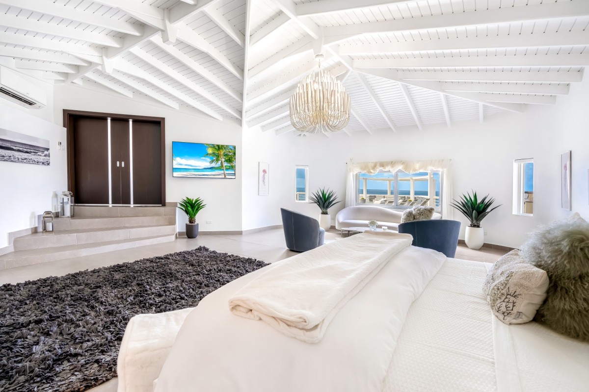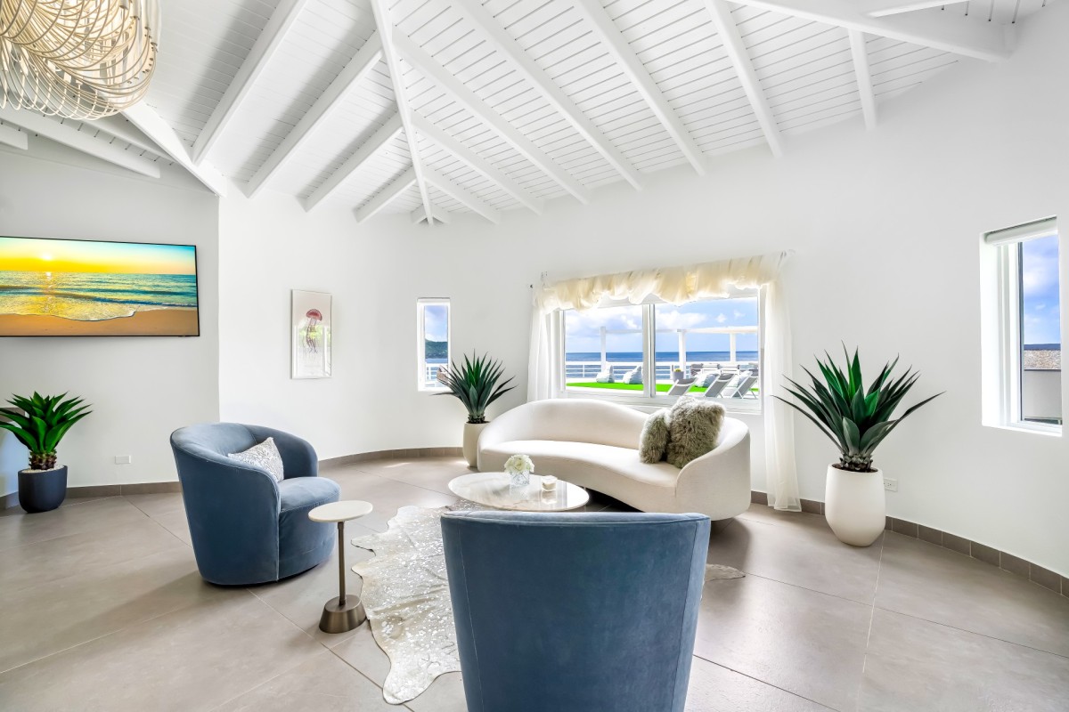 The villa’s crisp white design and open layout create seamless indoor–outdoor living, framed by turquoise waters and lush green mountains. The spacious living room offers stunning ocean vistas, while the beautifully equipped kitchen and multiple communal areas provide the perfect balance of social connection and relaxation.