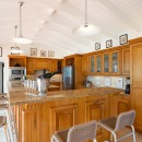 The gourmet kitchen, appointed with lustrous granite countertops and featuring a generous pass-through window to the main terrace, transforms meal preparation into a scenic experience overlooking Baie Rouge's pristine coastline.