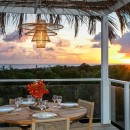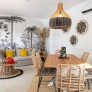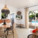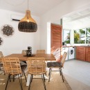 The open-plan living and kitchen areas showcase a neutral, bohemian aesthetic with an abundance of wood, straw, and linen accents throughout. The indoor dining table, also seating six, offers a cooler, air-conditioned option for dining. The kitchen, adjacent to the living space, boasts spacious and tall countertops, making it ideal for a comfortable cooking experience. Additionally, guests have the option to hire a personal chef to elevate their vacation. The kitchen's sea and greenery views provide the perfect backdrop for enjoying spectacular sunsets from the comfort of the villa. The kitchen and living area seamlessly blend into a communal space, perfect for socializing while ensuring privacy for the adjacent bedrooms.