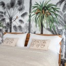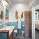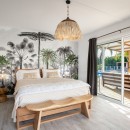 The villa exudes a rustic ambiance while also invoking a welcoming sense of arrival. As you step through the beach-hut-style entrance, you'll find yourself immersed in the splendid outdoor area. Here, a generous pool glistens in the sunlight year-round, surrounded by lush vegetation. An outdoor shower resembles a leaf's stem, blending seamlessly with nature. To the right of the pool, two palm trees adorned with string lights create a serene atmosphere as the sun sets. Wooden daybeds on the opposite side of the pool provide the perfect spot for sunbathing and enjoying a refreshing beverage.