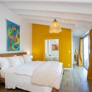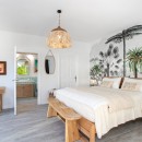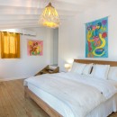 The villa comprises two bedrooms, both featuring generously sized king beds, en-suite bathrooms, and walk-in closets. The first bedroom can be accessed from its exterior entrance on the left, immersing guests in a serene sanctuary adorned with organic materials and textures that evoke a natural ambiance. The second bedroom, attached to the main living and kitchen area, is unveiled through a set of gentle steps. Continuing the organic theme, this bedroom features pops of deep mustard shades, combining mountain coziness with a summery and light feel.