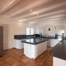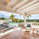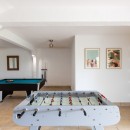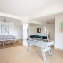 The thoughtfully arranged bedrooms ensure complete privacy, with three situated on the main level, each boasting its en-suite bathroom. Descending the exterior stairs reveals an independent area housing two additional bedrooms, each with its bathroom. An entertaining games room, equipped with foosball and pool tables, adds a playful touch to the villa.