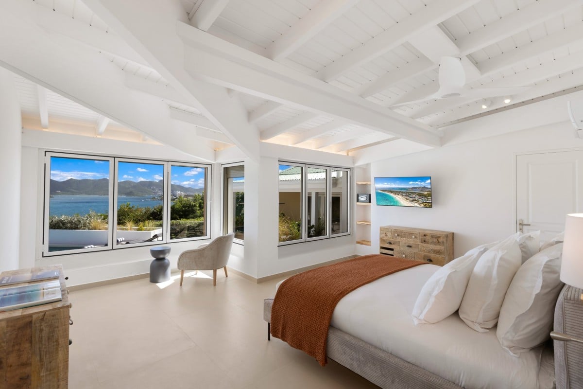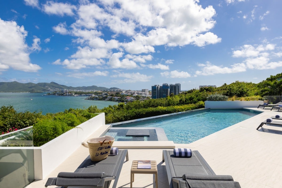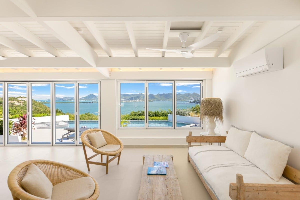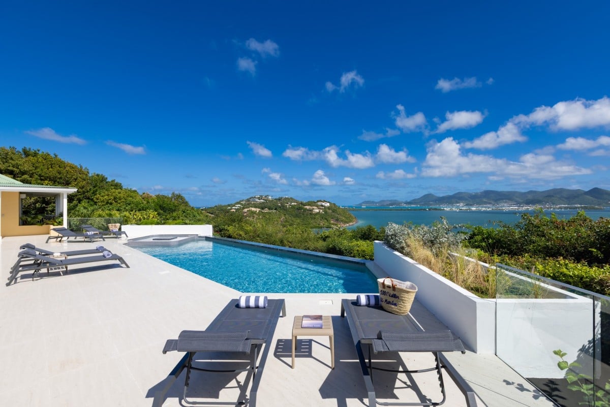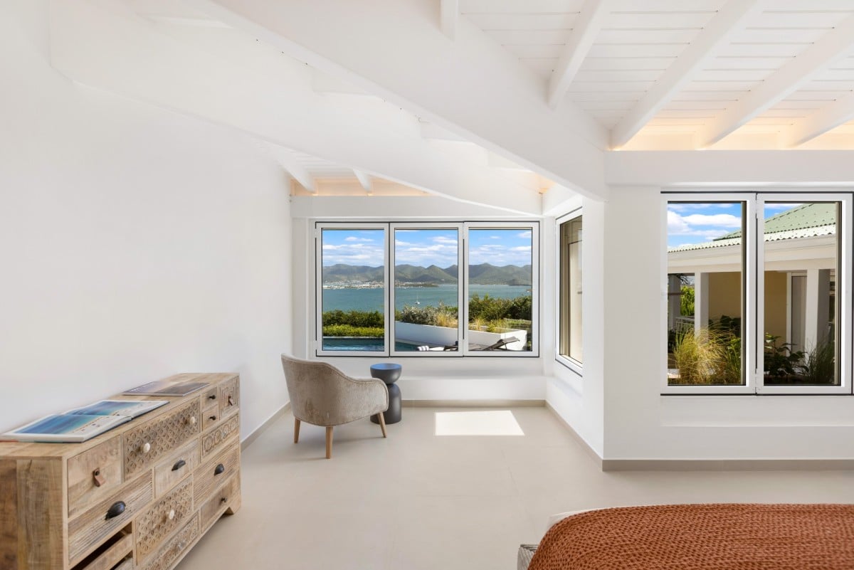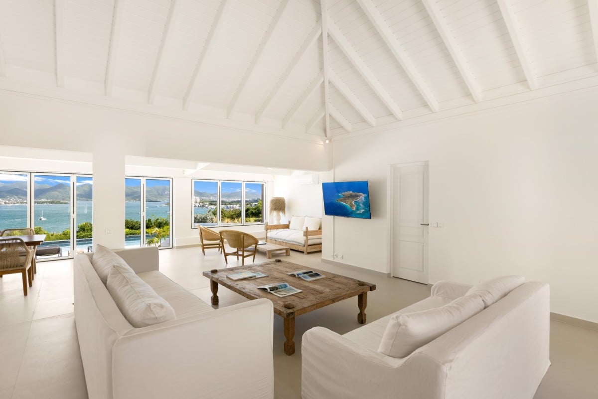 Dramatically positioned on a cliffside, the villa boasts breathtaking panoramic views over the turquoise waters of Simpson Bay Lagoon and the island’s lush surroundings, visible from both the living areas and the bedrooms.