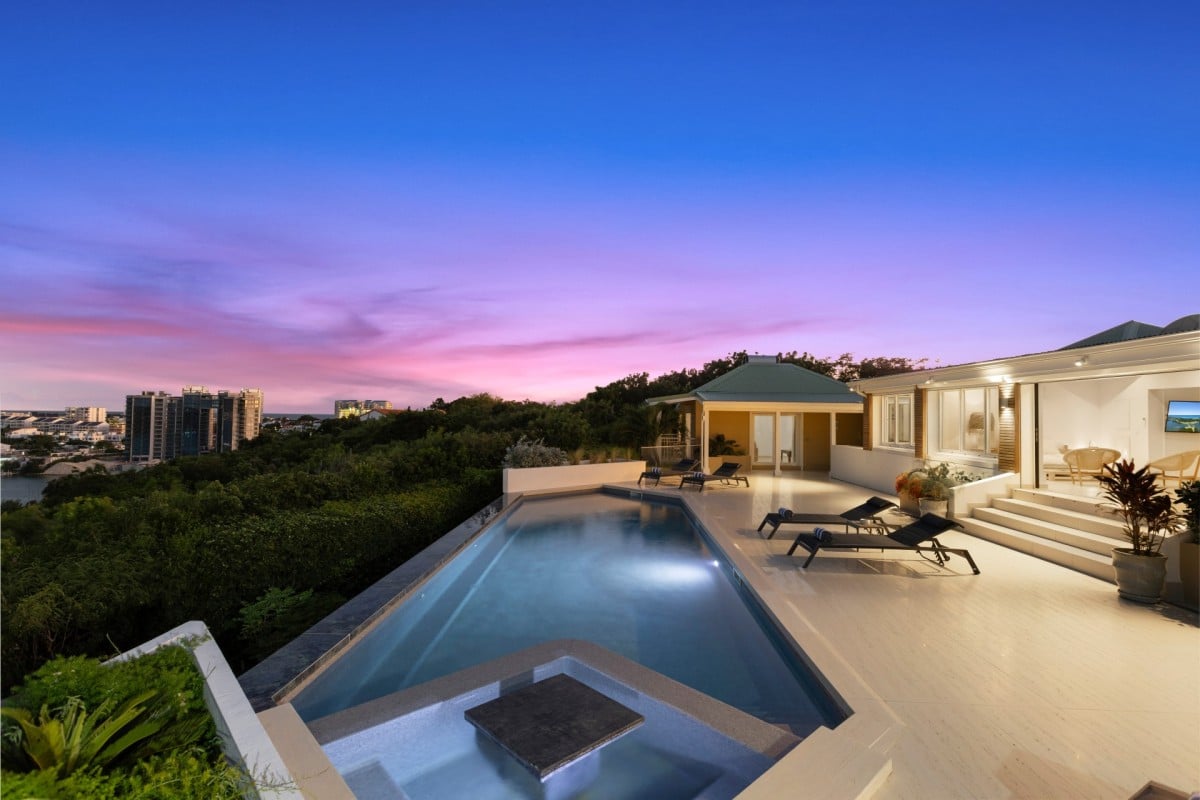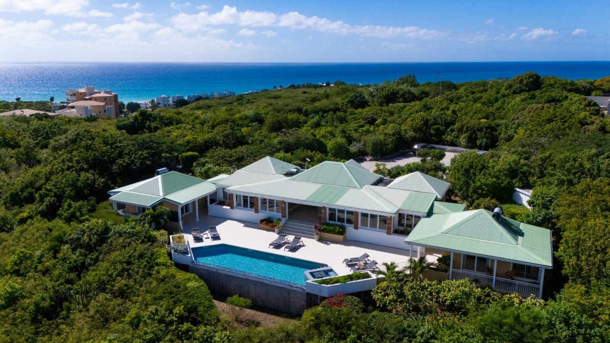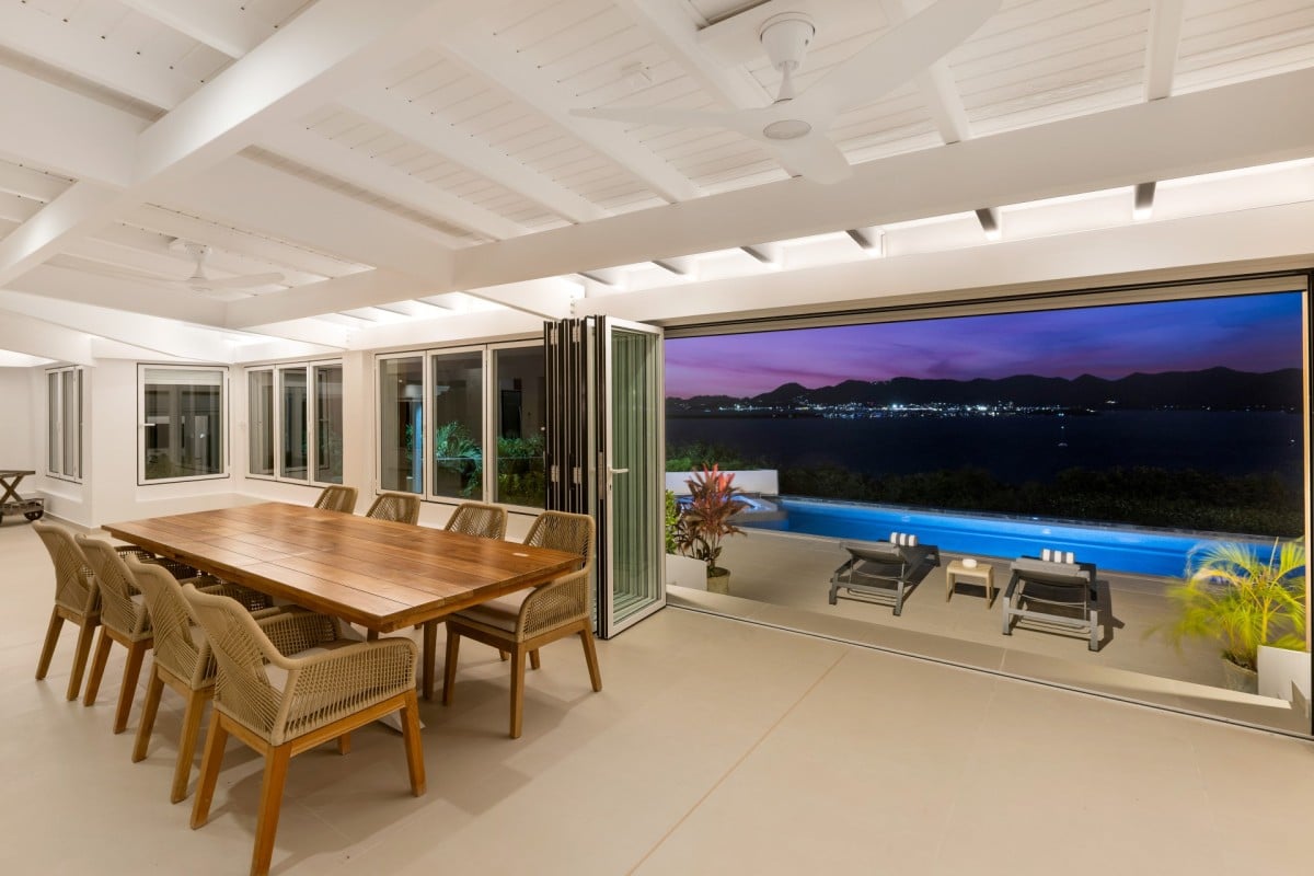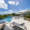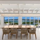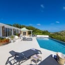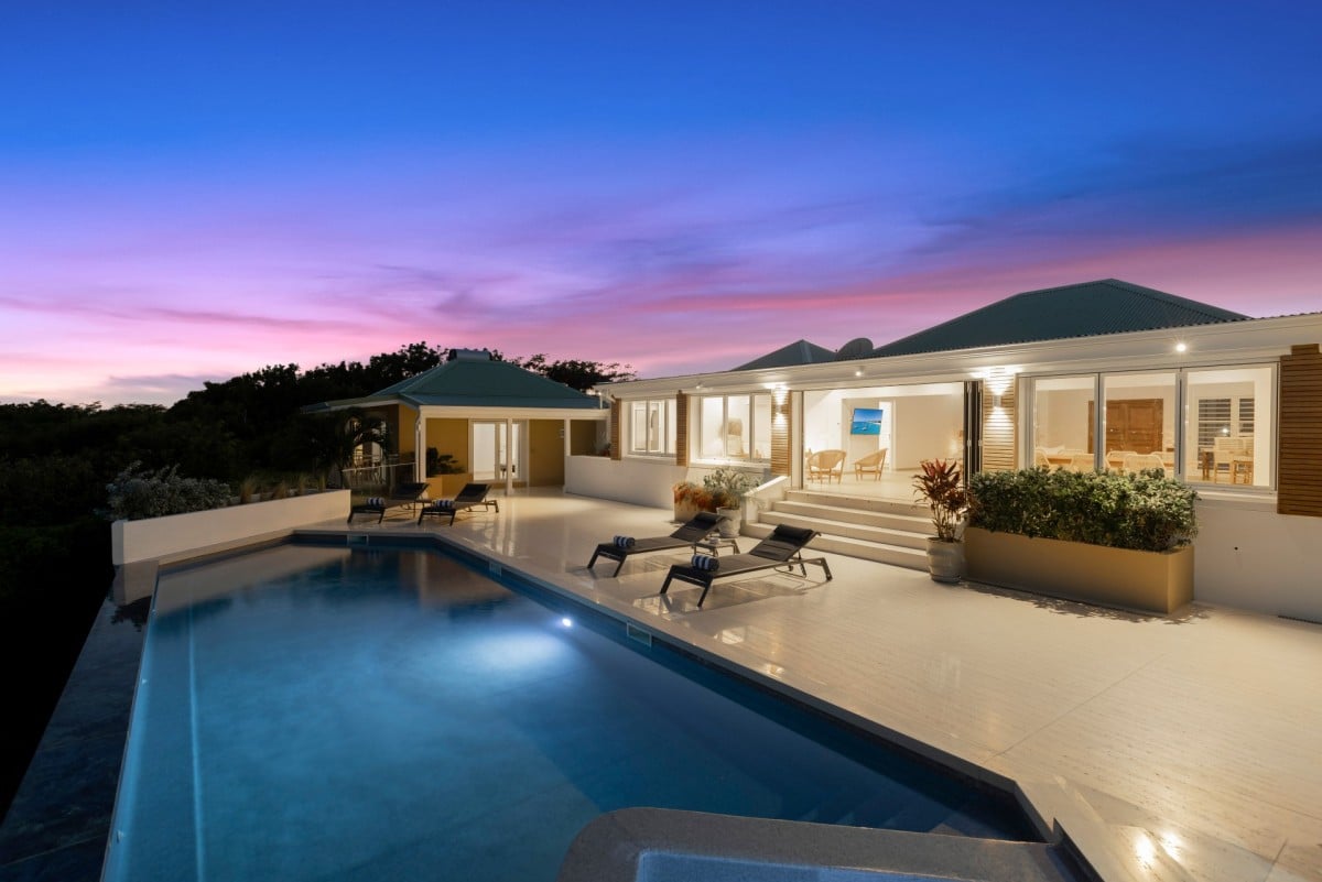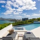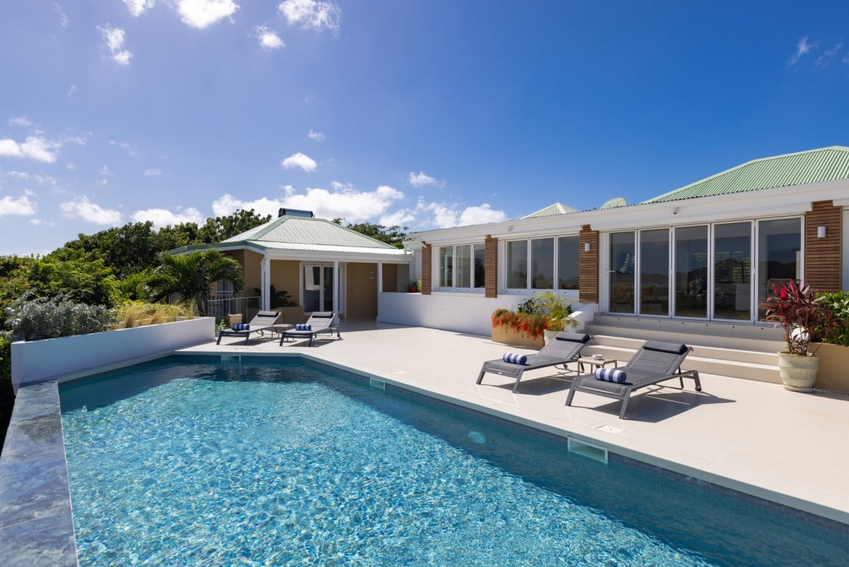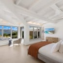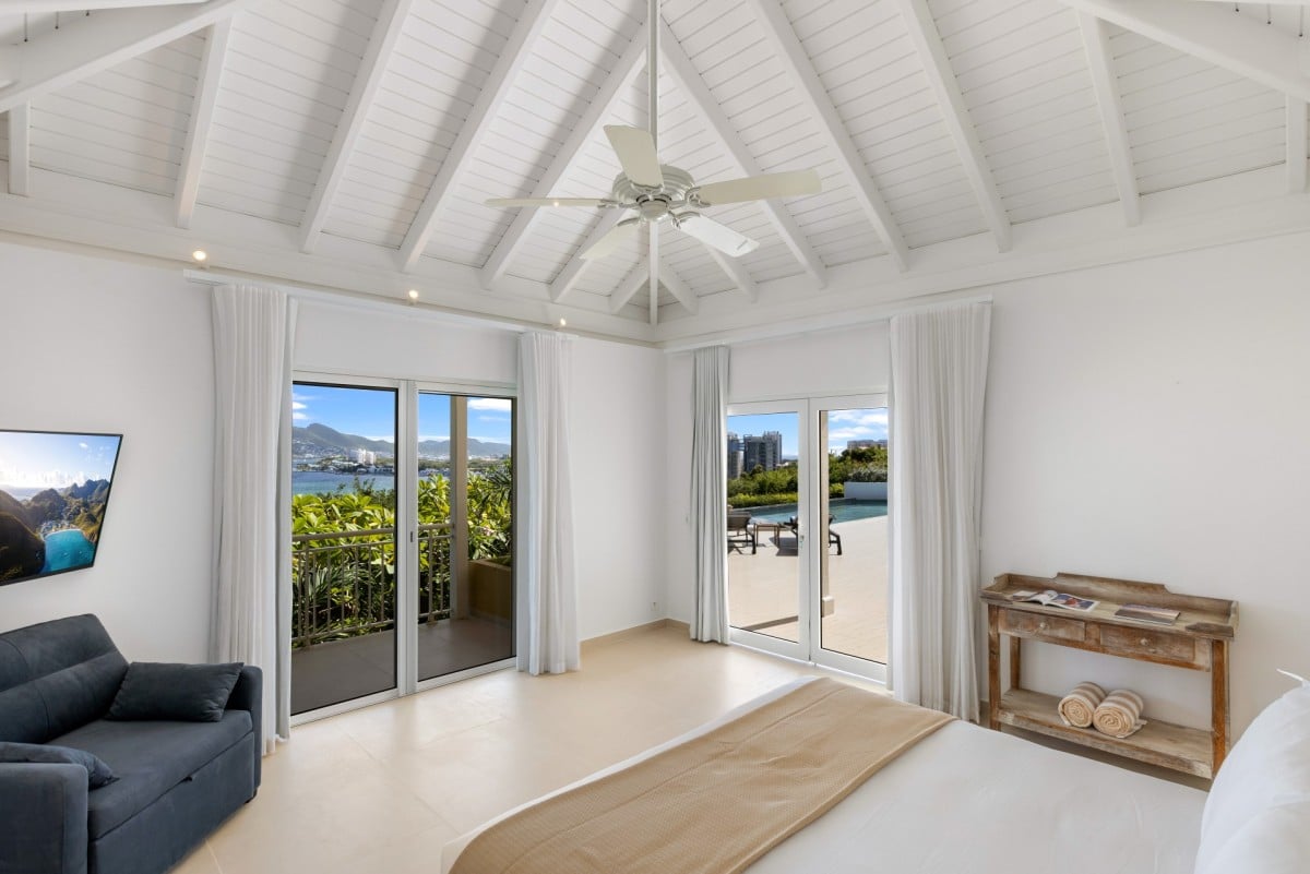 Dramatically positioned on a cliffside, the villa boasts breathtaking panoramic views over the turquoise waters of Simpson Bay Lagoon and the island’s lush surroundings, visible from both the living areas and the bedrooms.