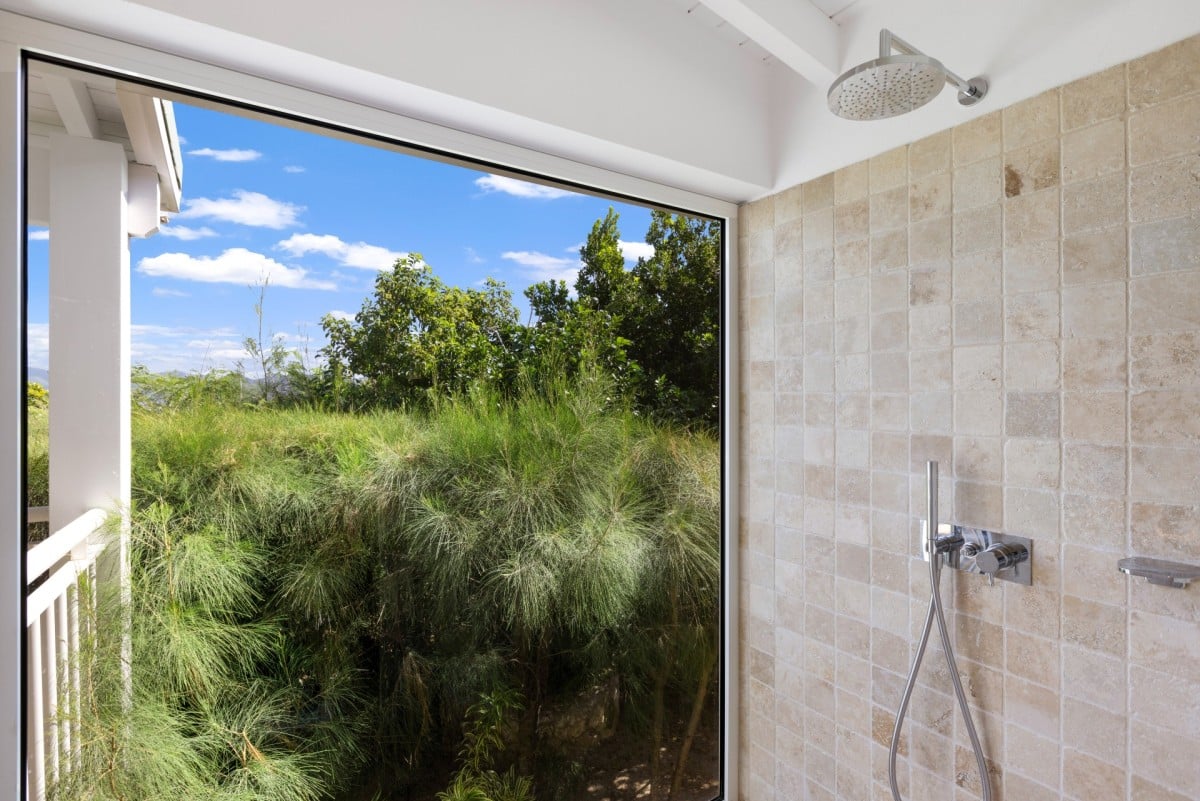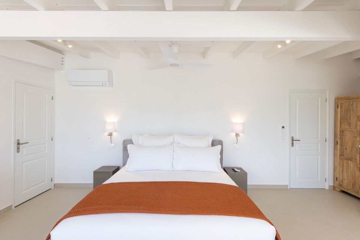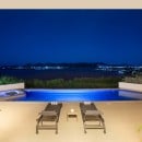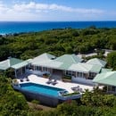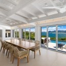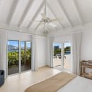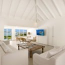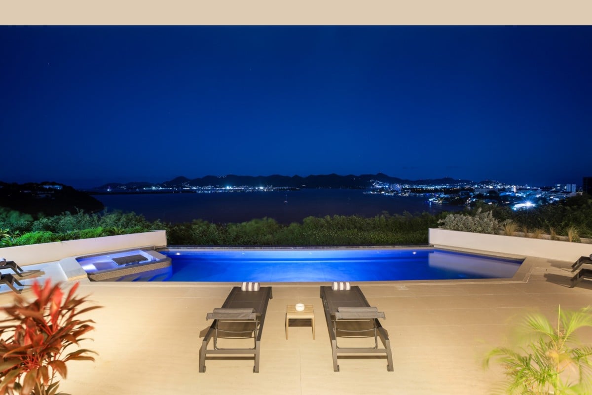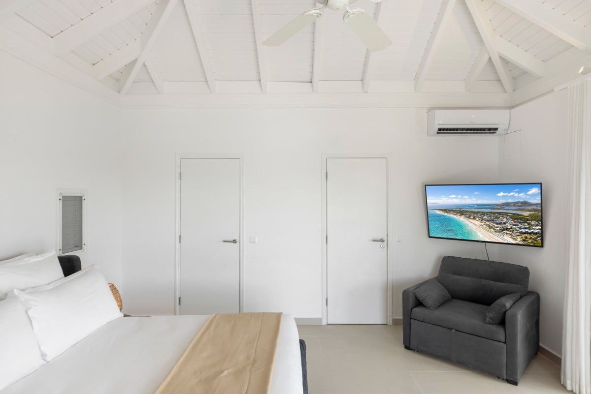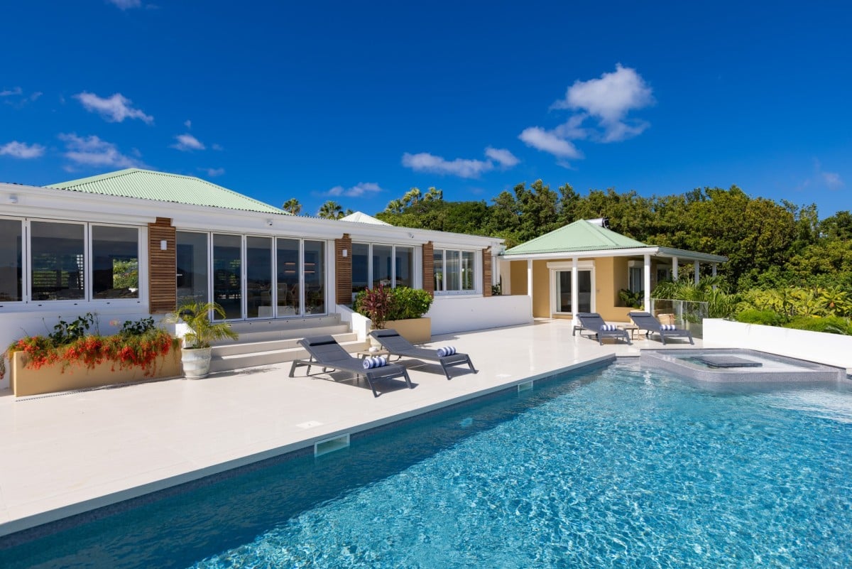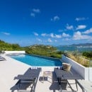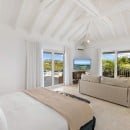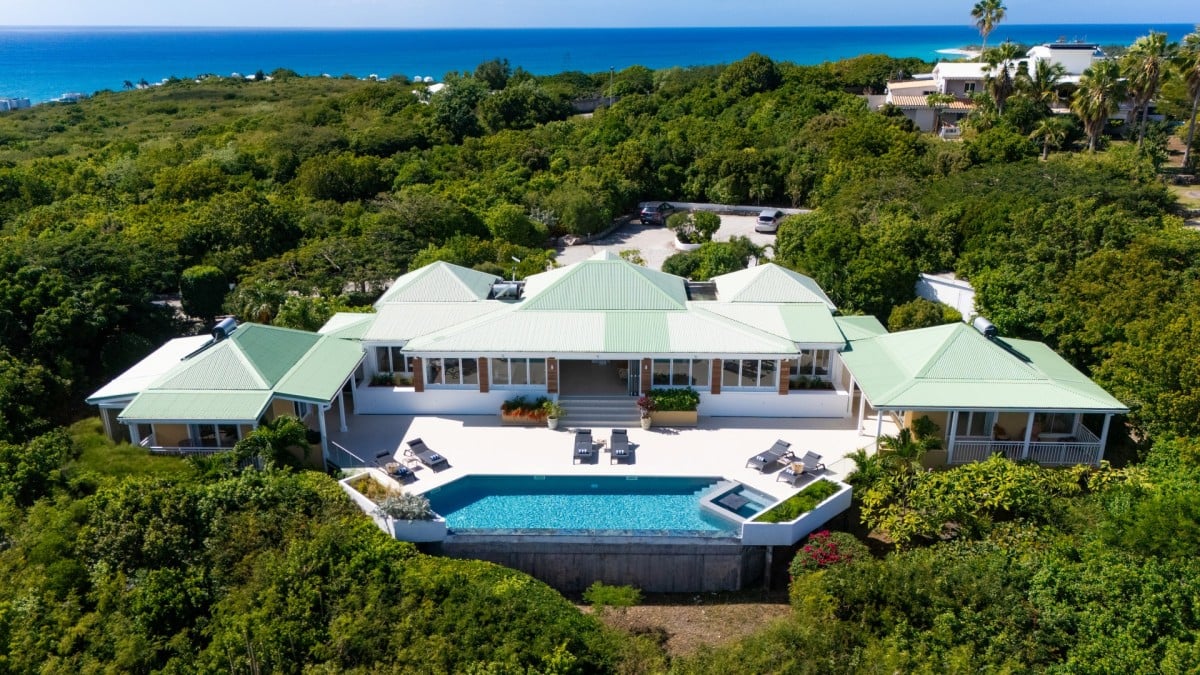Dramatically positioned on a cliffside, the villa boasts breathtaking panoramic views over the turquoise waters of Simpson Bay Lagoon and the island’s lush surroundings, visible from both the living areas and the bedrooms.