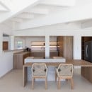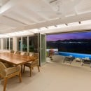 The open-plan living spaces extend seamlessly onto a spacious, stylishly furnished terrace—an ideal setting for indoor-outdoor living—leading to the swimming pool. The pool features a shallow basin with an integrated table, perfect for relaxing and socializing while taking in the exceptional surroundings.