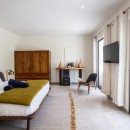 Bedroom 5: Bedroom with a king-size bed, A/C, WiFi, TV, safe, dresser, mini fridge, coffee maker, kettle, private patio, garden view, exterior access, and en-suite bathroom with shower, double vanity, and WC. 2 guests maximum. Lower floor