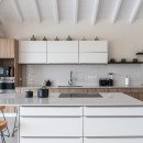 An elegant pink door beckons you into the heart of an open-concept space, featuring a sleek and comfortable living room with designated TV and conversation areas. The modern wood-toned kitchen boasts terrazzo countertops, while the vibrantly lit dining area showcases a custom travertine dolmen table.