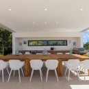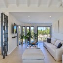 A row of glass doors opens onto a spacious terrace adorned with custom outdoor sofas, a stunning swimming pool, inviting lounge beds, an outdoor kitchen with a BBQ, and a dining area for savoring meals and drinks as the sun sets in the west.