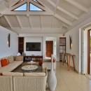 At one end of the luxurious terrace is a bungalow housing two of the four bedrooms. The other end is where the remaining bedrooms and the shared living spaces are found. Within this larger structure guests will be astonished by the spacious and yet stylish décor and design. A covered terrace offers more outdoor living spaces, including an al fresco dining area, large and roomy lounge with banquet sofa, and further lounge chairs.