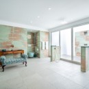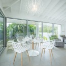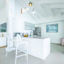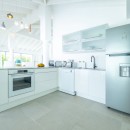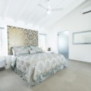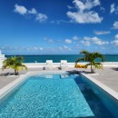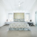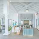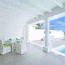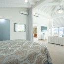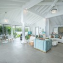 The interior living area is reminiscent of a winter wonderland with chic snow-white decor accented by a faux fireplace and flat-screen TV. Guests can enjoy indoor and outdoor dining at the villa. In fact, the outer walls of the villa are collapsible glass walls so guests can open the villa fully to enjoy the caressing Caribbean breeze and tropical aroma of the seaside air.