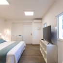 Once fully indoors, you experience an entirely unique setting. With high wooden ceilings and a palette emphasizing white, the great room uses lots of bursts of color and modern design to create a dynamic spot for gathering together for meals or lounging. There is a media room with entertainment system and a low-key dining room that opens into the modern kitchen. Fully equipped with the very best appliances and gear, it is a bright and airy space that even the most discerning cooks in your group will adore on first sight.