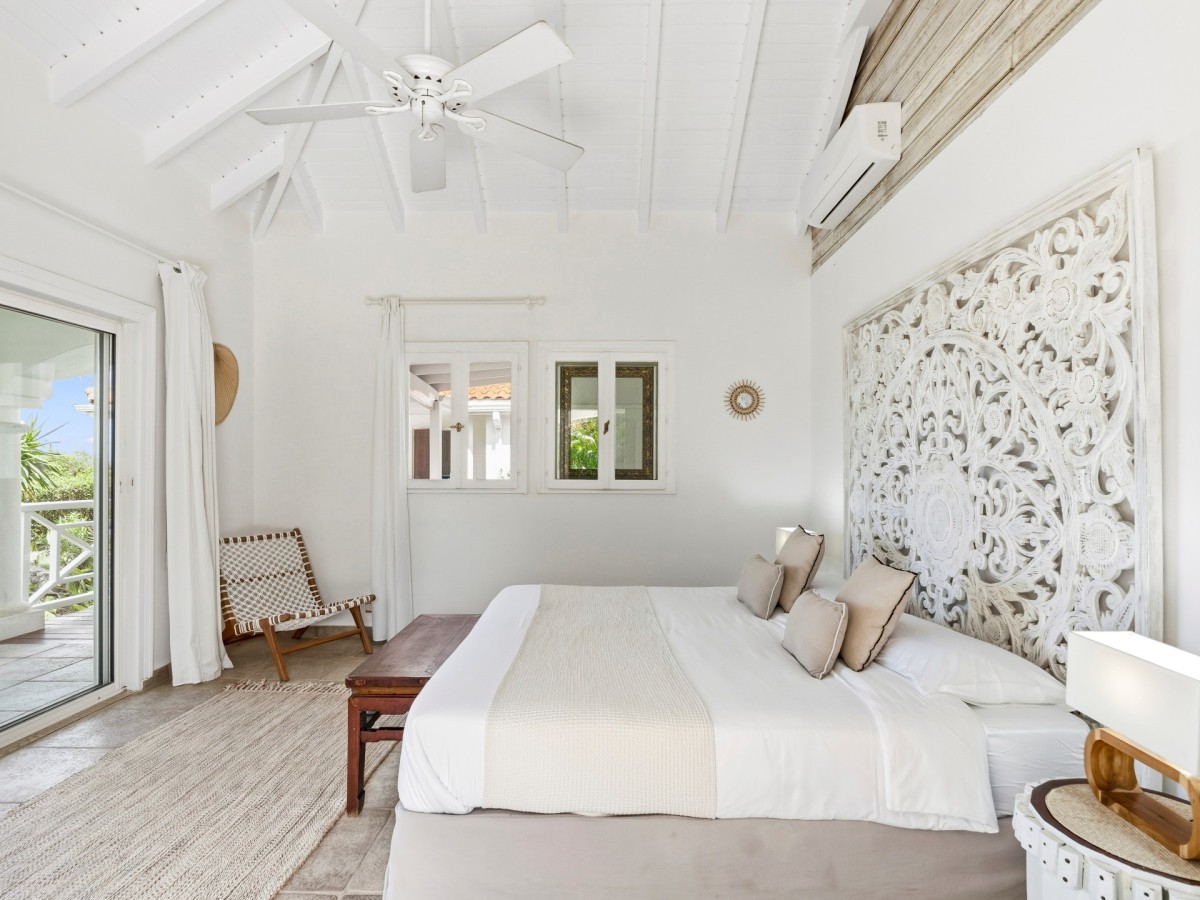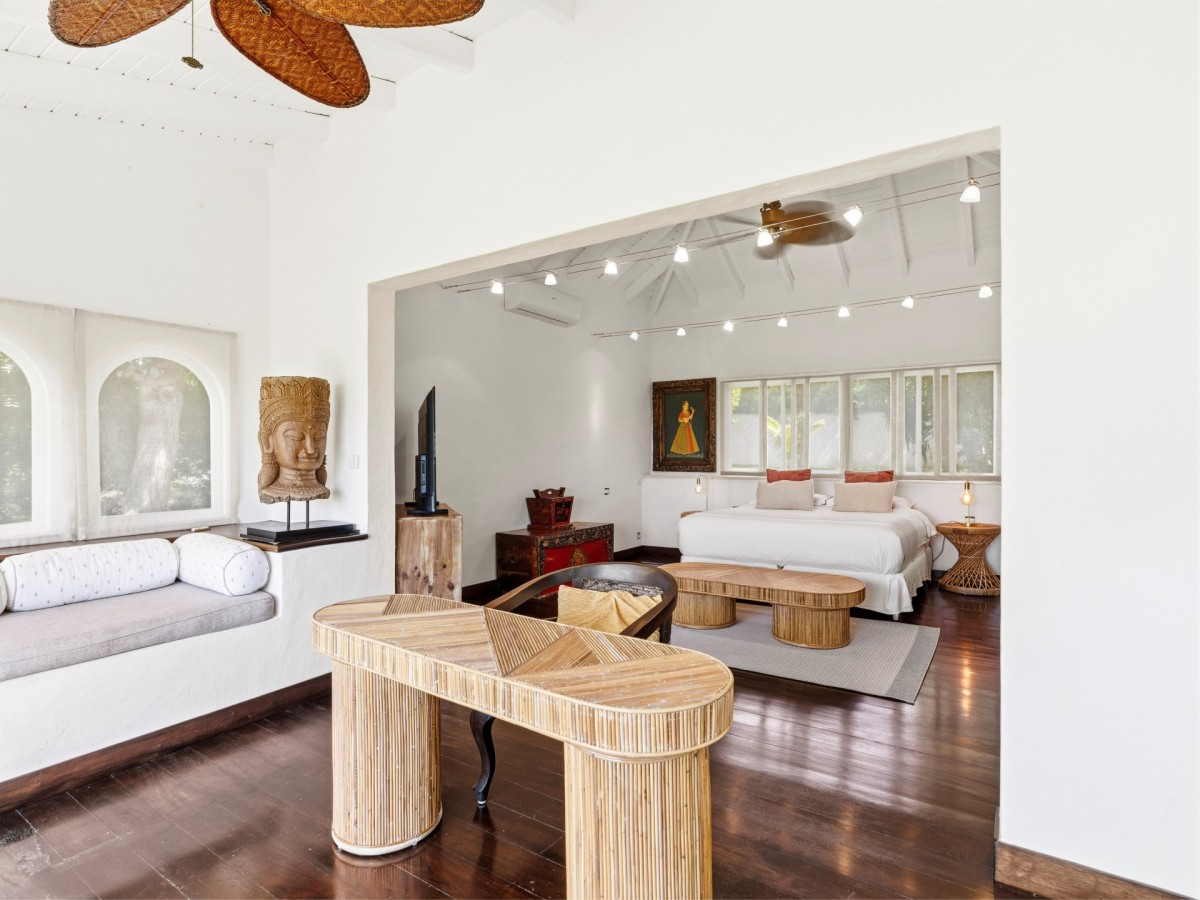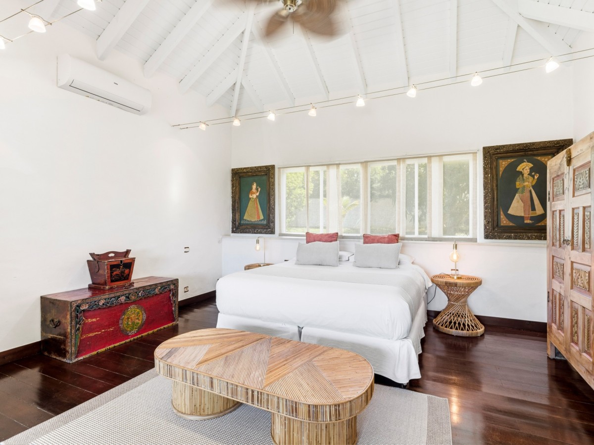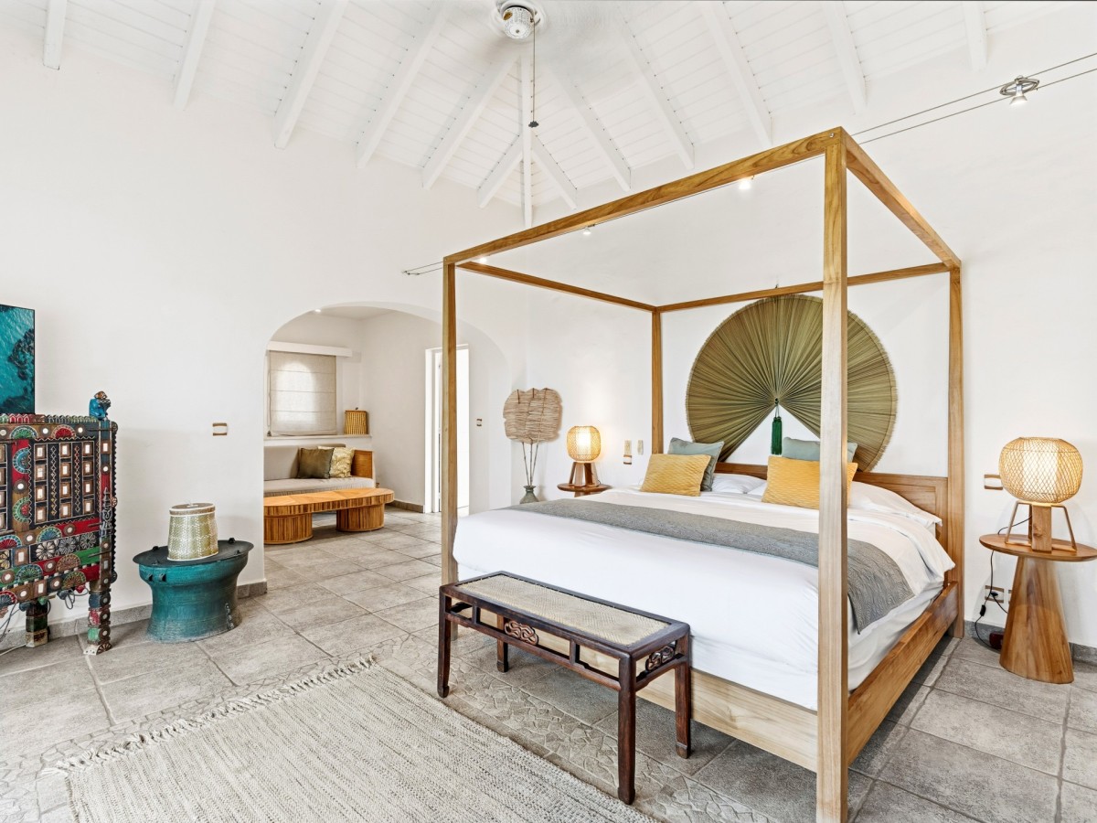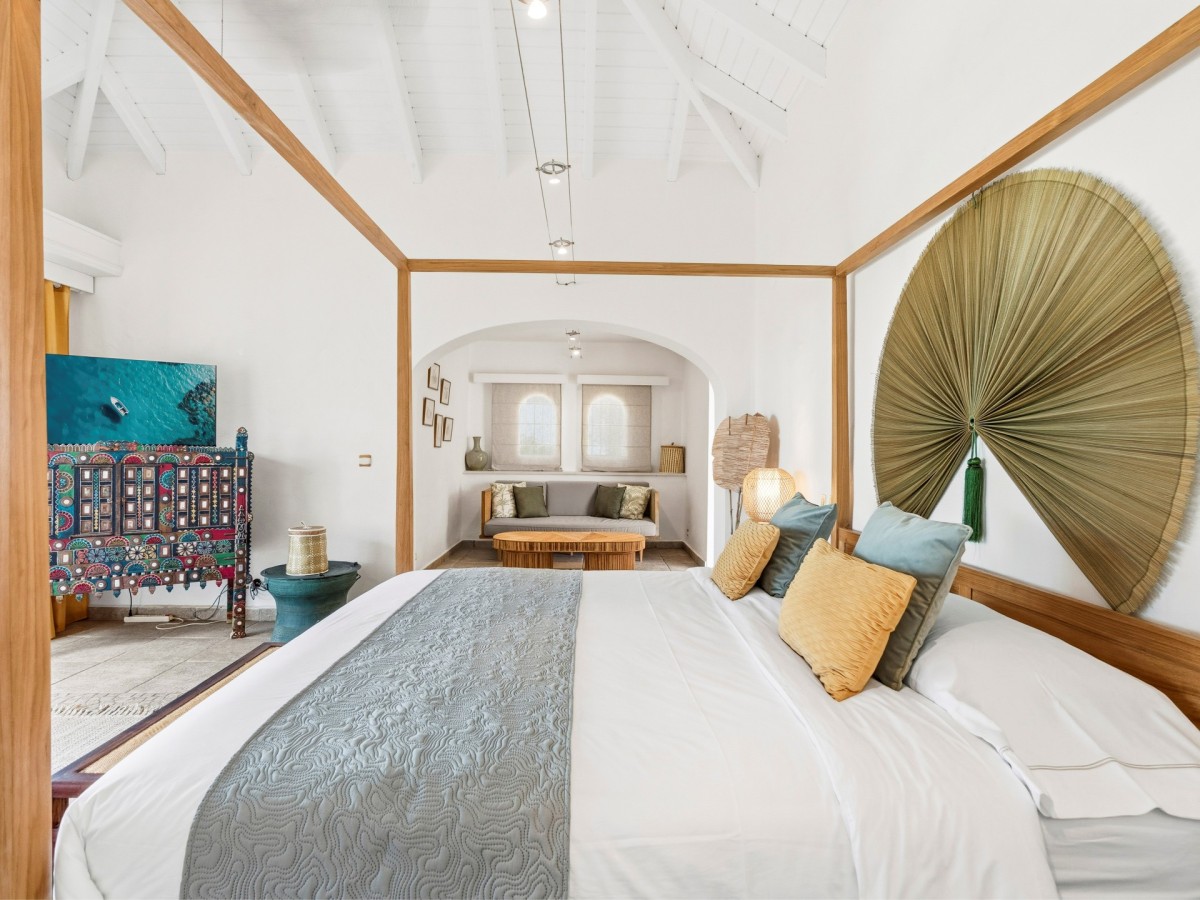 Just outside there is a huge, shimmering blue pool, a handy poolside bar to have a relaxing drink after a vigorous swim and a gazebo adjacent to the state of the art kitchen where you can enjoy your meal as you watch the sun set over the gorgeous azure ocean. This brightly and eclectic designed villa offers exceptional privacy. With large spaces and magical gardens and fountains, every day you stay in this villa, you will feel like you are in absolute paradise.