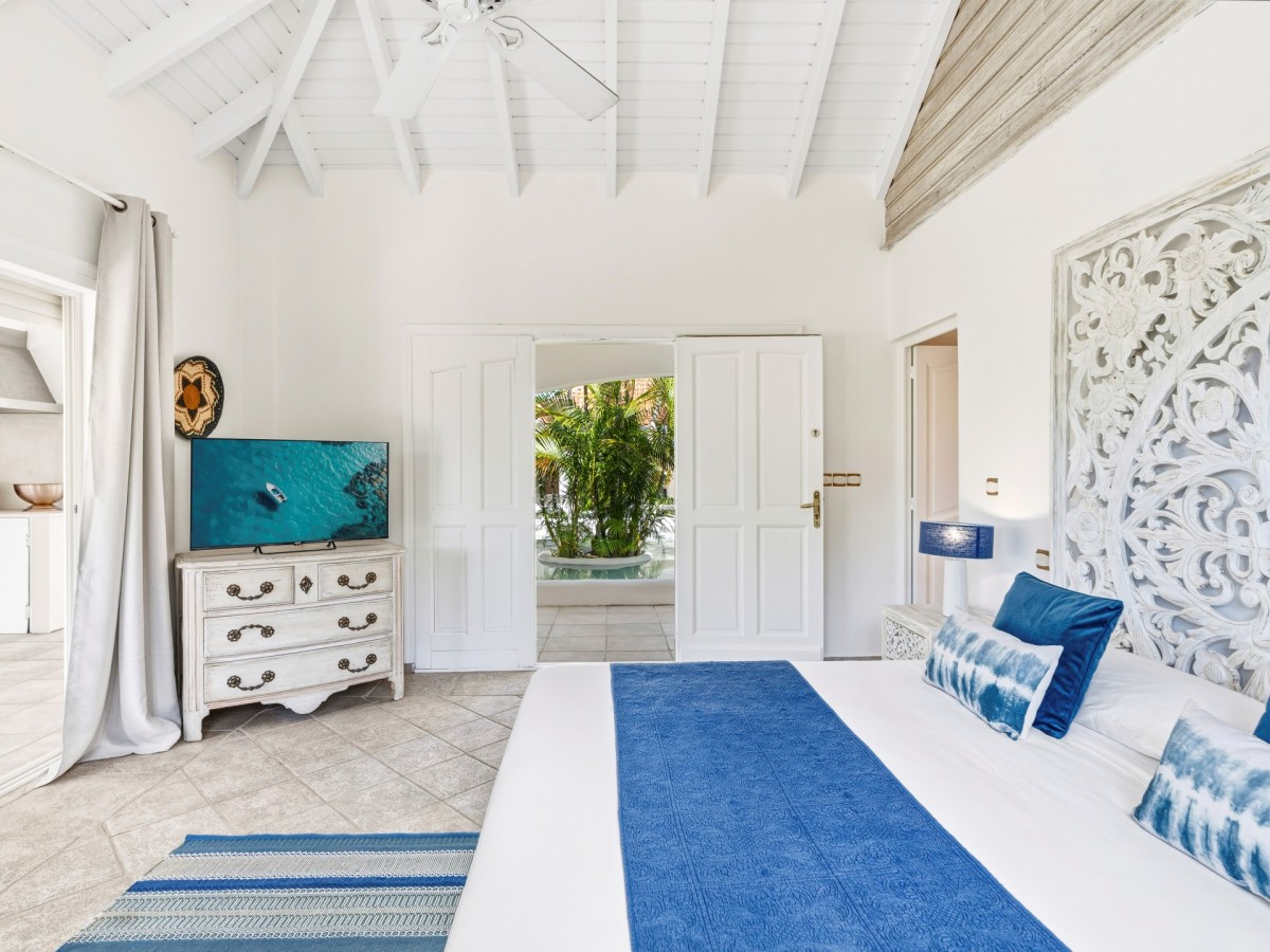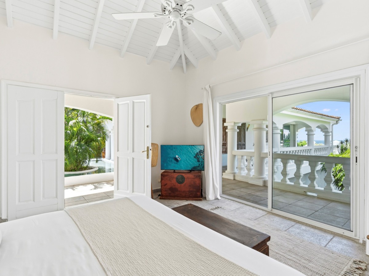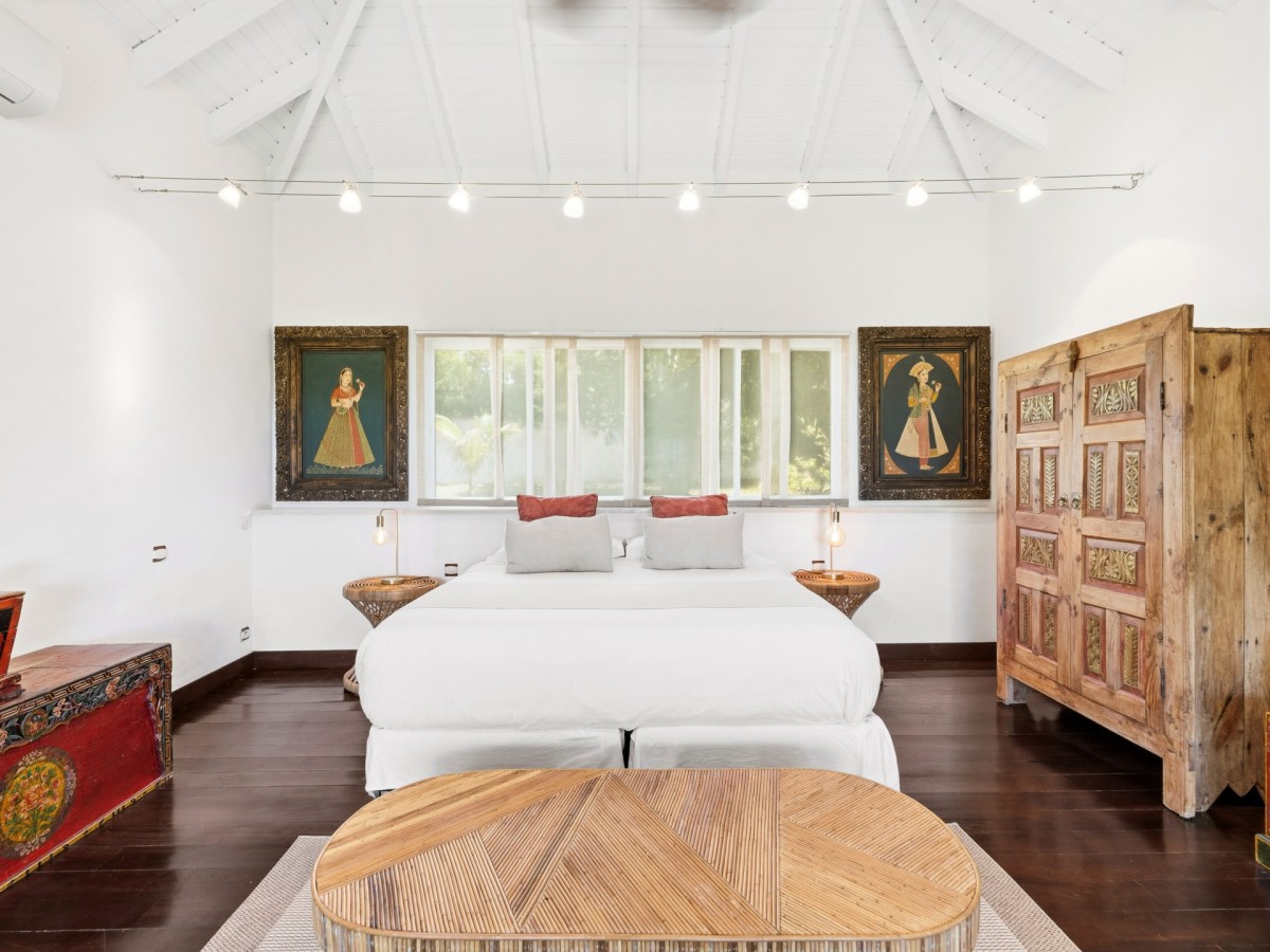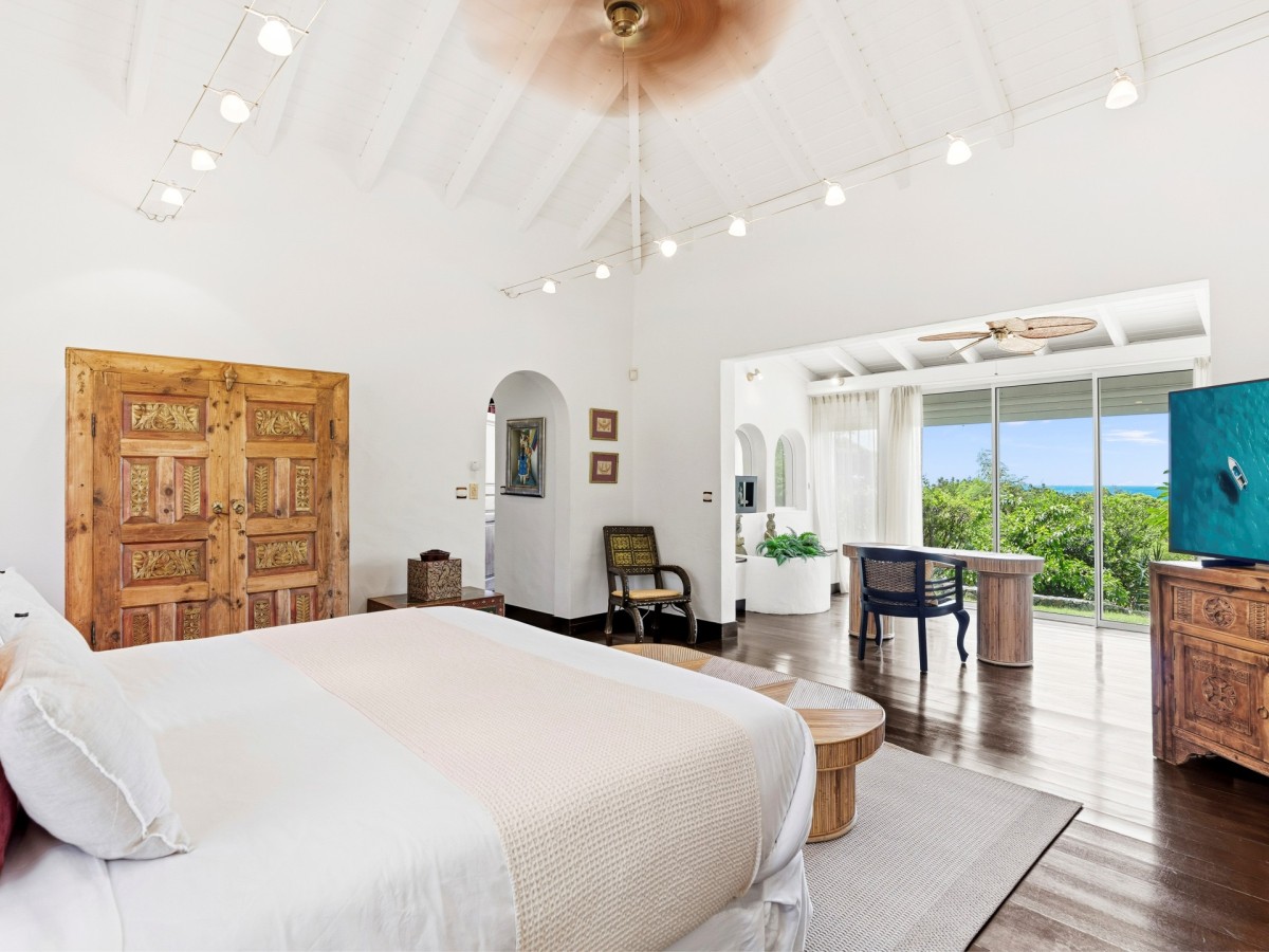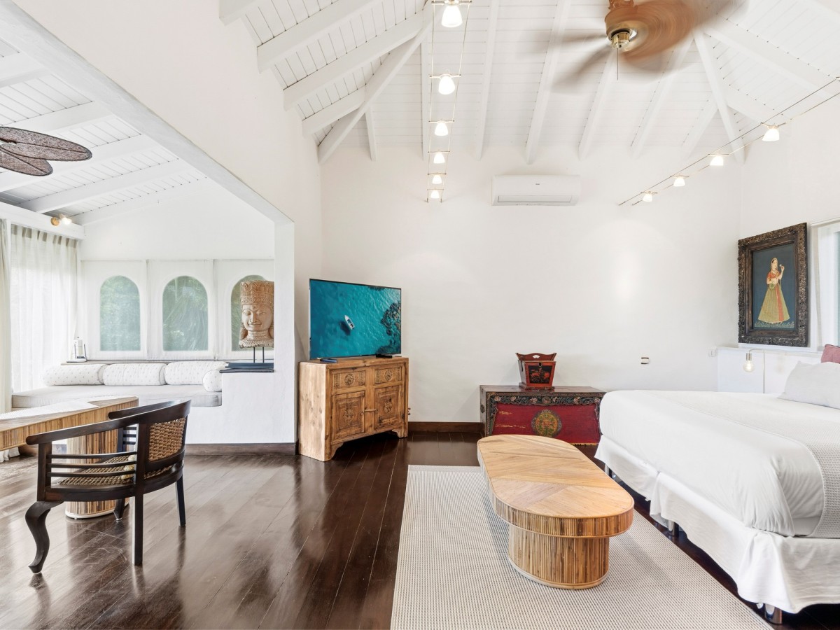 Just outside there is a huge, shimmering blue pool, a handy poolside bar to have a relaxing drink after a vigorous swim and a gazebo adjacent to the state of the art kitchen where you can enjoy your meal as you watch the sun set over the gorgeous azure ocean. This brightly and eclectic designed villa offers exceptional privacy. With large spaces and magical gardens and fountains, every day you stay in this villa, you will feel like you are in absolute paradise.